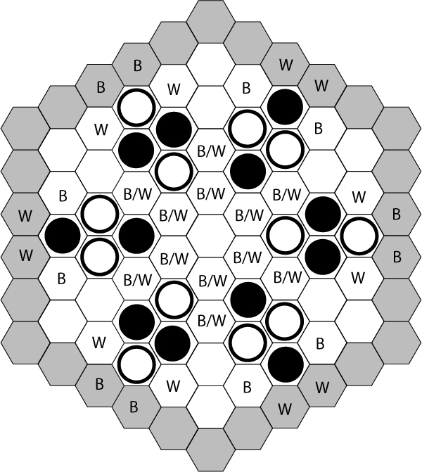 Hexagonal Reversi is played with two colors of tokens (indicated here with black and white circles). The game starts with the following configuration.